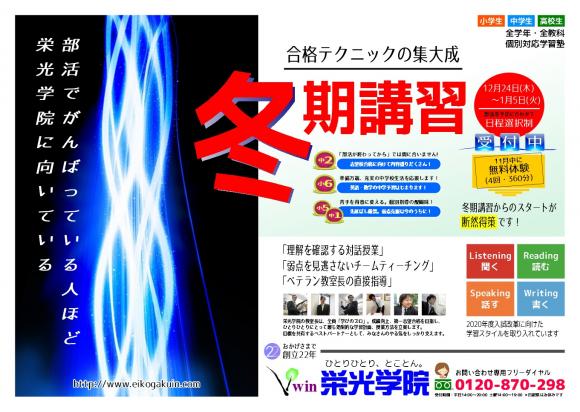 栄光学院ちはら台進学館では12月24日(木)より冬期講習が始まります。 ただいまお申込み受付中です。まずは4回の体験授業からお試しください。 詳しくはこちらをクリック! *講習期間中(12/24-1/5)は、お電話受付 9時〜20時に変更となります。 *体験授業のお申込み、学習相談などにおきましては直接ご来塾頂いた場合、授業優先のため再度お越しいただく手間をおかけしてしまう事もございます。お問い合わせの際はお電話を頂戴できますと幸いです。